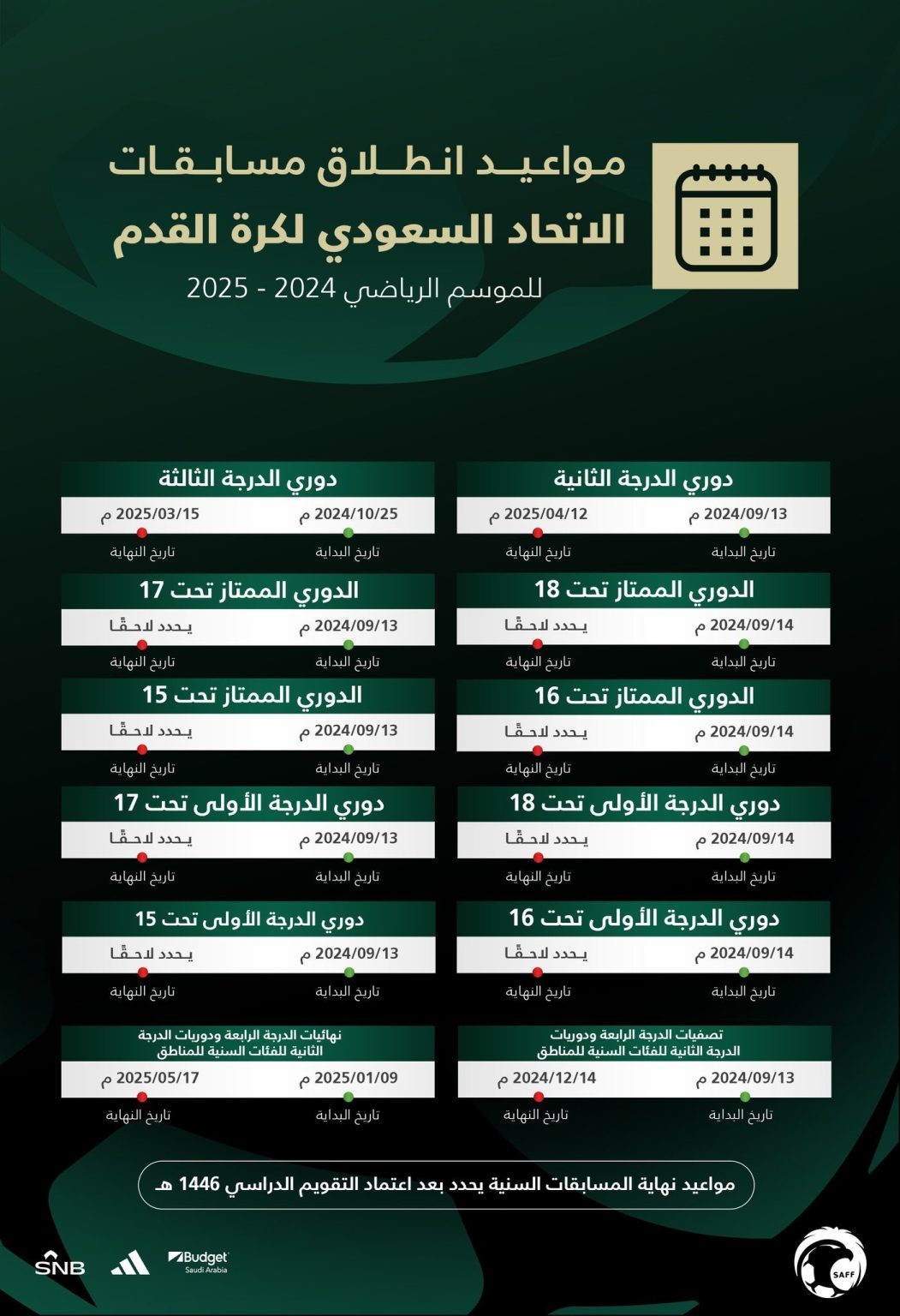 أصدرت لجنة المسابقات في الاتحاد السعودي لكرة القدم روزنامة المسابقات الكروية التي يندرج تنظيمها تحت مظلة الاتحاد السعودي للموسم الرياضي المقبل 2024 ـ 2025.