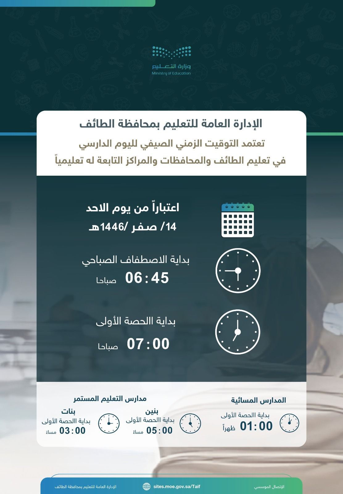 تعليم الطائف يعتمد التوقيت الزمني لليوم الدراسي للعام 1446هـ