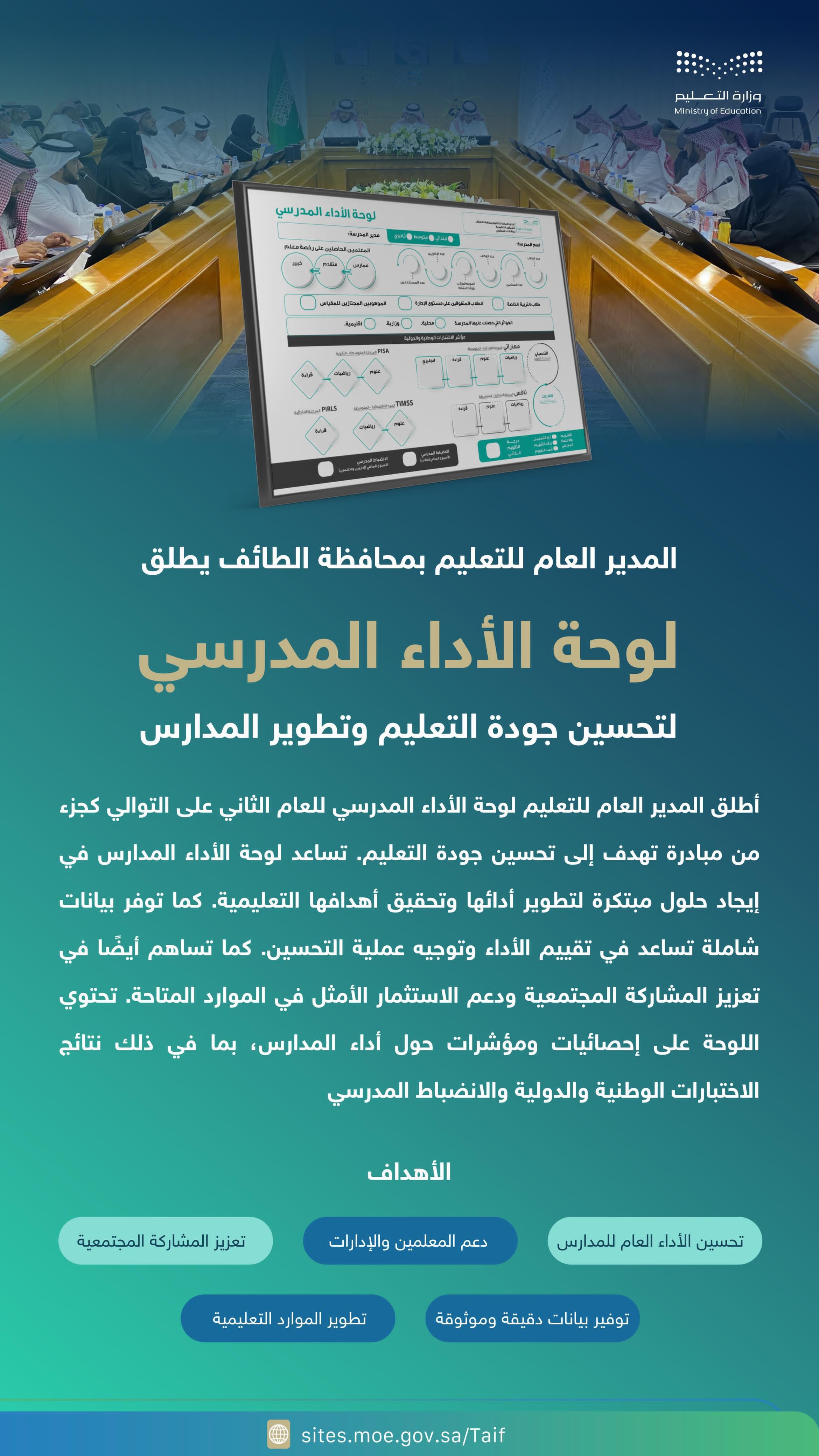أطلق المدير العام للتعليم في الطائف الدكتور سعيد بن عبدالله الغامدي لوحة الأداء المدرسي لتحسين جودة التعليم وتطوير المدارس للعام الثاني على التوالي كجزء من مبادرة تهدف إلى تحسين جودة التعليم. وتساعد لوحة الأداء المدارس في إيجاد حلول مبتكرة لتطوير أدائها وتحقيق أهدافها التعليمية.