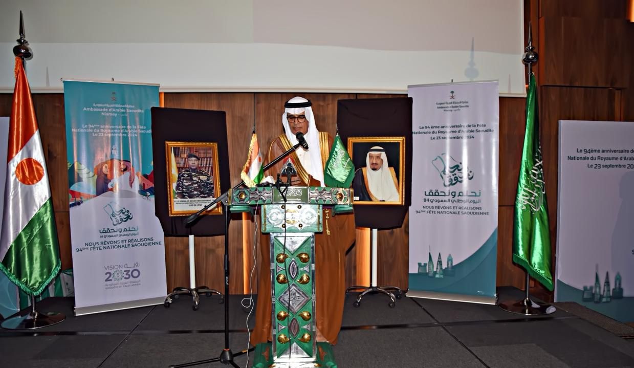وفي كلمة ألقاها بهذه المناسبة، أشار سفير خادم الحرمين الشريفين لدى النيجر الدكتور/ زيد بن مخلد الحربي، إلى أن المملكة تتبوأ مكانةً مرموقة في العالم على كافة الأصعدة السياسية والثقافية والاقتصادية، وأنه سعياً لتحقيق المزيد من النمو الاقتصادي، تم في عام 2016م إطلاق رؤية المملكة 2030، وهي رؤية لسيدي صاحب السمو الملكي الأمير محمد بن سلمان بن عبدالعزيز آل سعود - حفظه الله -، ولي العهد، رئيس مجلس الوزراء، وأنها خطة جريئة وقوية للنهوض بالمملكة العربية السعودية، وذكر أن الرؤية تشكل الجانب الذي ترتكز عليه قرارات المملكة الحالية، في الوقت الحالي والسنوات المقبلة حتى عام 2030م، وأضاف أن الرؤية تشمل كذلك، مبادرة "السعودية الخضراء" و"الشرق الأوسط الأخضر"، والتي قام بإطلاقها سيدي صاحب السمو الملكي الأمير محمد بن سلمان بن عبدالعزيز آل سعود -حفظه الله-، ولي العهد، رئيس مجلس الوزراء، بتاريخ 27/3/2021م، وتهدف مبادرة "السعودية الخضراء" إلى تحسين جودة الحياة وحماية الأجيال القادمة، وزيادة مستوى الغطاء النباتي وتقليل انبعاثات الكربون، ومكافحة التلوّث وتدهور الأراضي، والحفاظ على الحياة البحرية، أما مبادرة "الشرق الأوسط الأخضر"، فتهدف إلى تنسيق الجهود ومواكبة التطورات الإقليمية والدولية والتي تطلقها المملكة كخارطة طريق إقليمية للمنطقة للإسهام بشكل كبير في تحقيق الأهداف العالمية لمواجهة التغيّر المناخي، كما تطرق سعادته في حديثه، إلى العلاقات السعودية النيجرية، موضحاً أن البلدين مرتبطان بعلاقات تاريخية ودبلوماسية قوية، مبنية على أسس سياسية واجتماعية ودينية، حيث إن كلا البلدين عضو مؤسس في منظمة التعاون الإسلامي، إضافةً إلى وجود العديد من المصالح المشتركة بينهما، ووجود تنسيق على مستوى عالٍ بين قيادتي البلدين في المحافل الدولية، وتمويل المملكة العديد من المشاريع والبرامج التنموية والإنسانية في النيجر.