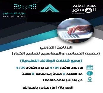 نفذت الإدارة العامة للتعليم بمنطقة مكة المكرمة، ممثلة في قسم التعليم المستمر البرنامج التدريبي بعنوان "حقيبة الخصائص والمفاهيم لتعليم الكبار"، نفذته المشرفة أمل باعبدالله، لمديرات ومعلمات التعليم المستمر، والذي يهدف إلى اكساب المتدربات المفاهيم والمهارات اللازمة لتعليم الكبار وفق الأسس والمفاهيم العملية، وبإشراف مباشر من قبل رئيسة قسم التعليم المستمر دلال اللحياني، بمساندة مديرة الابتدائية الخامسة صفية التركي،