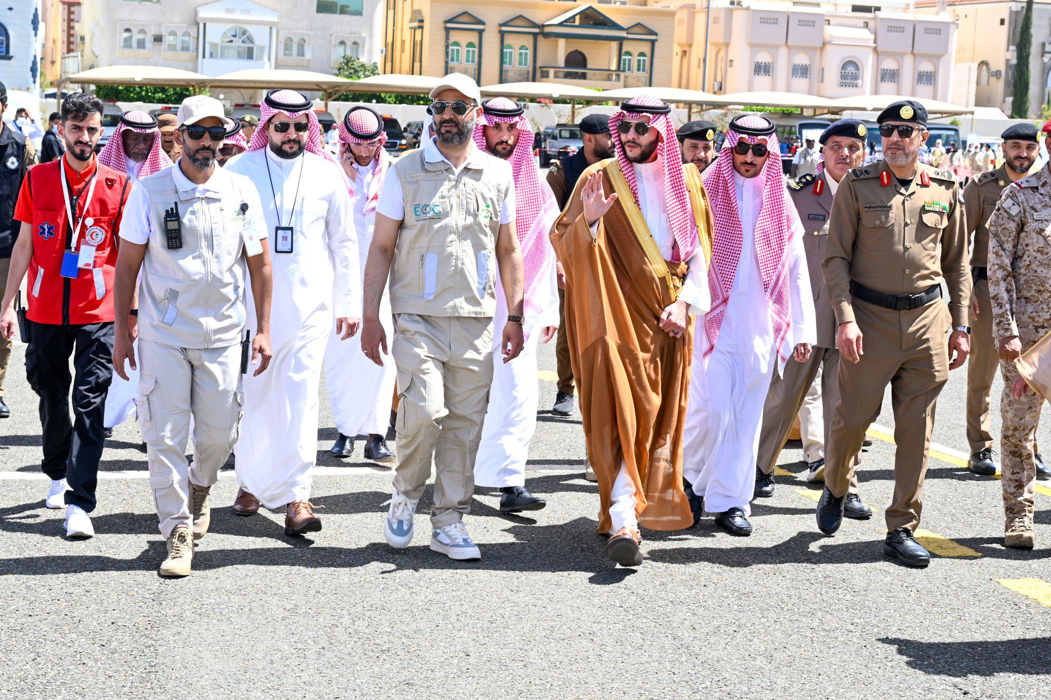 وشهد سموه تنفيذ فرضية ميدانية شارك فيها أكثر من 30 جهة حكومية وخاصة، إلى جانب 100 متطوع ومتطوعة من مختلف القطاعات، بهدف اختبار مدى الجاهزية ورفع كفاءة التعامل مع الحالات الطارئة خلال موسم الحج.