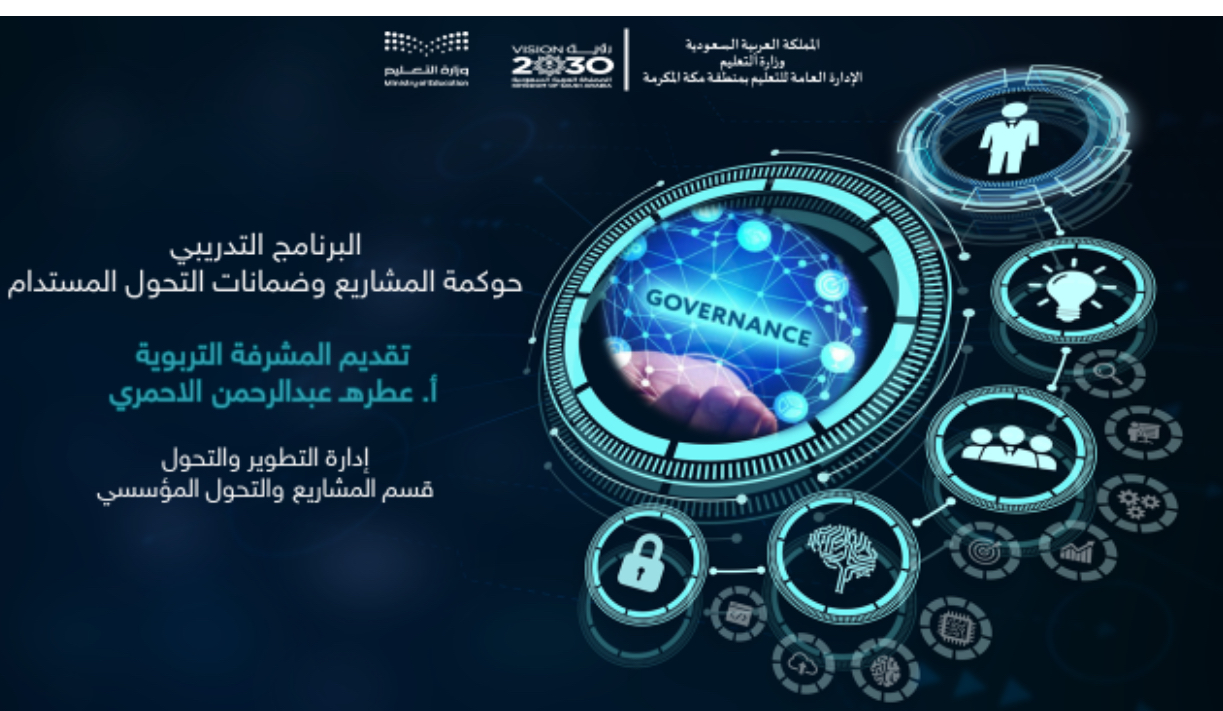 عقدت الإدارة العامة للتعليم بمنطقة مكة المكرمة ممثلةً في إدارة التطوير والتحول - قسم المشاريع والتحول المؤسسي- البرنامج التدريبي " حوكمة المشاريع وضمانات التحول المستدام " ، نفذته المشرفة التربوية عطرة الأحمري لمدة ثلاثة أيام من الثلاثاء 26/ 6/ 1447هـ حتى تاريخ 27/ 6/ 1447هـ.