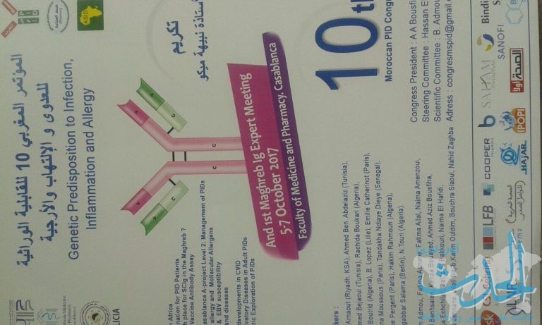 المؤتمر الوطني العاشر لضعف المناعة الأولي سيكون خلال الفترة الممتدة من 5 إلى 7 أكتوبر 2017 بكلية الطب والصيدلة بالدارالبيضاء .