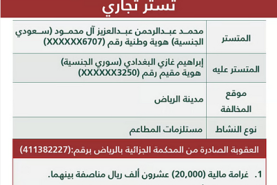 شهرت وزارة التجارة السعودية بكل من المواطن "محمد عبدالرحمن عبدالعزيز آل محمود" والمقيم السوري "إبراهيم غازي البغدادي" لارتكابهما جريمة التستر...