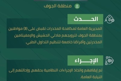 في إطار جهودها الحثيثة لمكافحة آفة المخدرات، تمكنت المديرية العامة لمكافحة المخدرات من القبض على ثلاثة مواطنين في منطقة الجوف....