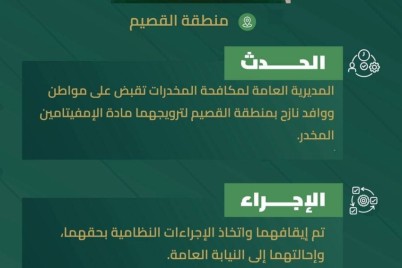 قبضت المديرية العامة لمكافحة المخدرات على مواطن ووافد نازح بمنطقة القصيم لترويجهما مادة الإمفيتامين المخدر، وأوقفا واتخذت الإجراءات النظامية بحقهما،...