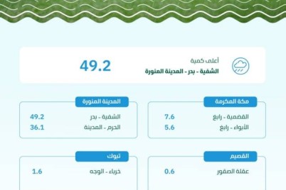 سجّلت منطقة المدينة المنورة أعلى معدلٍ لكميات هطول الأمطار بـ (49.2) ملم، في الشفية بمحافظة بدر، وذلك ضمن (6) مناطق...