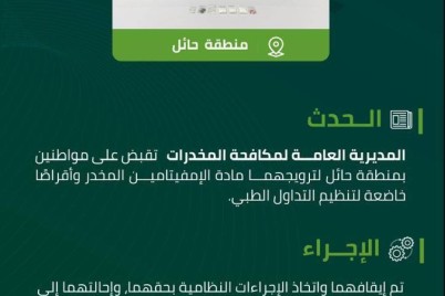 قبضت المديرية العامة لمكافحة المخدرات على مواطنين بمنطقة حائل لترويجهما مادة الإمفيتامين المخدر وأقراصًا خاضعة لتنظيم التداول الطبي، وجرى...