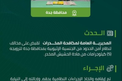 قبضت المديرية العامة لمكافحة المخدرات على مخالف لنظام أمن الحدود من الجنسية الإثيوبية بمحافظة جدة لترويجه (5) كيلوجرامات من مادة...