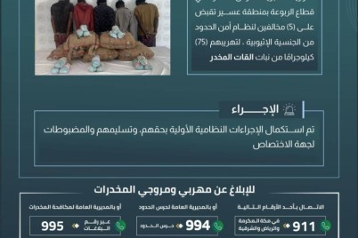 قبضت الدوريات البرية لحرس الحدود في قطاع الربوعة بمنطقة عسير على (5) مخالفين لنظام أمن الحدود من الجنسية الإثيوبية،...