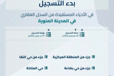 أعلن السجل العقاري اليوم, بدء استقبال طلبات التسجيل العيني الأول لـ (370) قطعة عقارية في 4 أحياء بالمدينة المنورة. ويشمل...