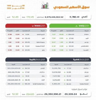 وبلغت كمية الأسهم المتداولة -وفق النشرة الاقتصادية اليومية لوكالة الأنباء السعودية لسوق الأسهم السعودية- 195 مليون سهم، تقاسمتها أكثر من 385 ألف صفقة، سجلت فيها أسهم 173 شركة ارتفاعًا في قيمتها, فيما أغلقت أسهم 33 شركة على تراجع.