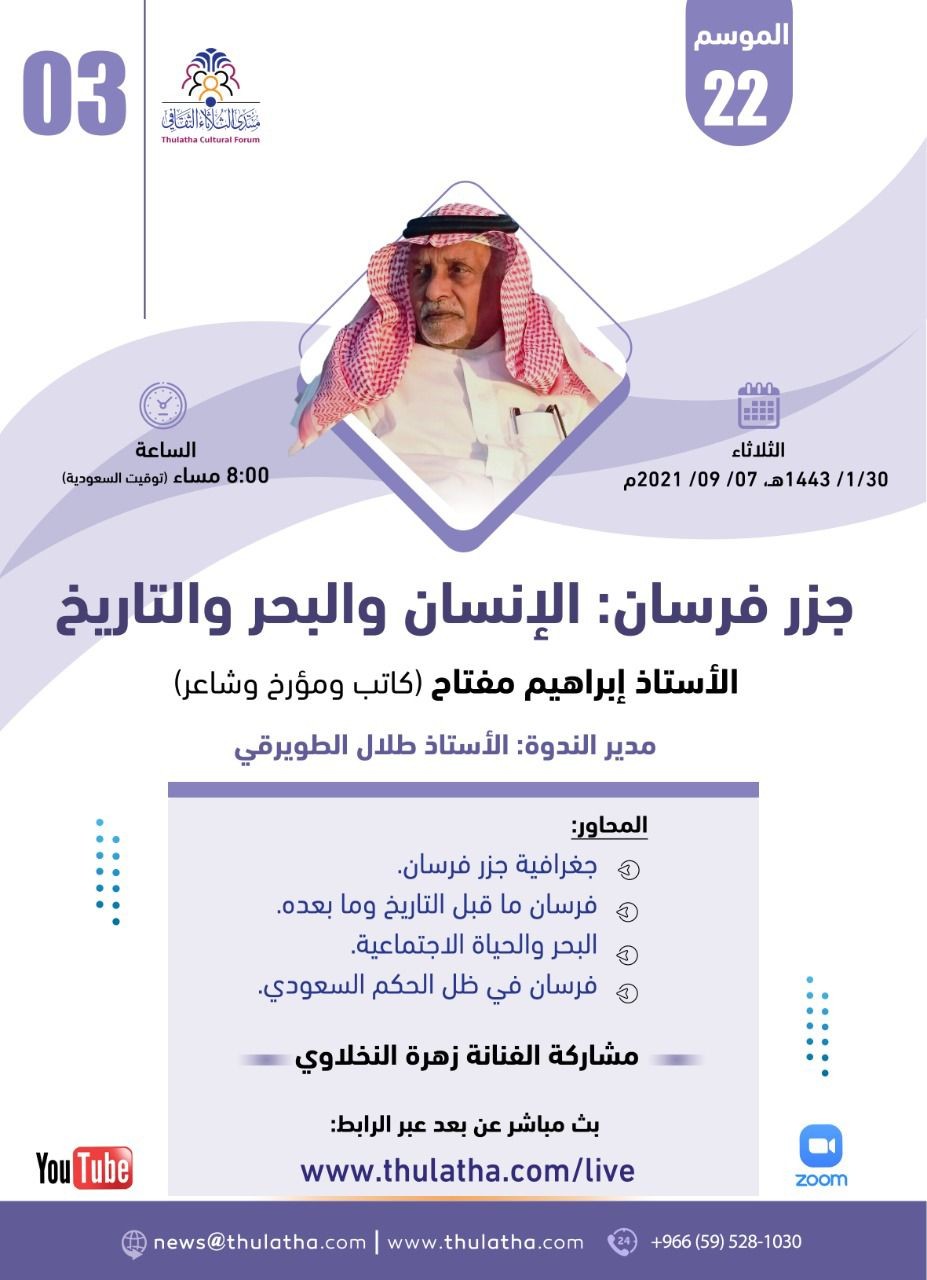 ينظم منتدى الثلاثاء الثقافي مساء الثلاثاء القادم ندوة تعريفية بجزر فرسان تحت عنوان "جزر فرسان: الإنسان والبحر والتاريخ".