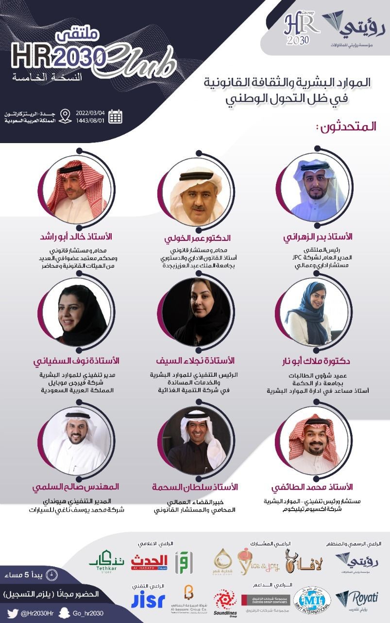 تشهد محافظة جدة  الجمعة القادمة إنطلاق ملتقي HR2030 CLUB في نسخته الخامسة بفندق الريتز كارلتون تحت عنوان " الموارد البشرية والثقافة القانونية في ظل التحول الوطني " .