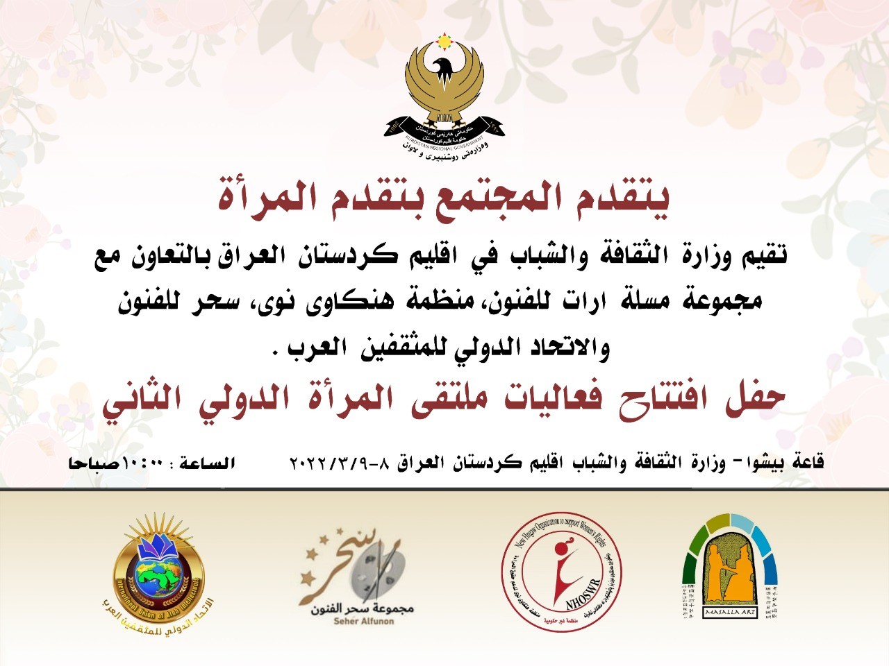 تنطلق فعاليات ملتقى المرأة الثاني يوم الثلاثاء 8مارس 2022 تحت شعار (يتقدم المجتمع بتقدم المرأة ) وذلك برعاية وزارة الثقافة والشباب في اقليم كردستان العراق في قاعة المعارض وقاعة المؤتمرات الكبرى في الوزارة وبالتعاون مع مجموعة مسلة ارت ومنظمة هنكاوى نوى لدعم حقوق المرأة ومجموعة سحر للفنون والإتحاد الدولي للمثقفين العرب برئاسة الشيخة : نوال الصباح