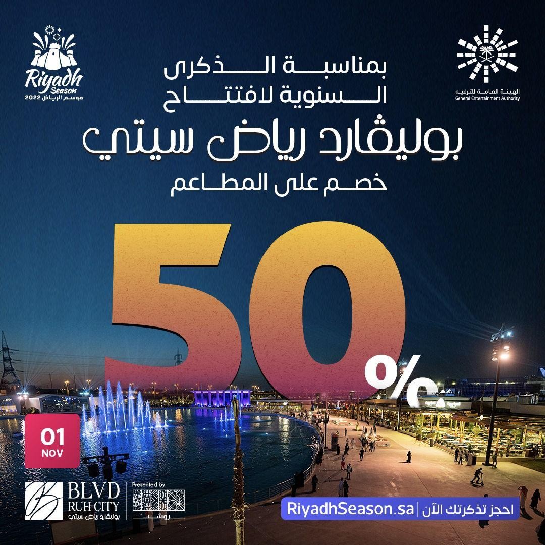 أعلن معالي رئيس مجلس إدارة الهيئة العامة للترفيه المستشار تركي بن عبدالمحسن آل الشيخ بمناسبة الذكرى الأولى لافتتاح منطقة بوليفارد رياض سيتي، إحدى أبرز مناطق موسم الرياض 2022، عن خصومات تصل إلى 50% على عدد من مطاعم المنطقة، إضافة إلى مجموعة من المفاجآت التي تستقبل بها الزوار مساء اليوم الثلاثاء.