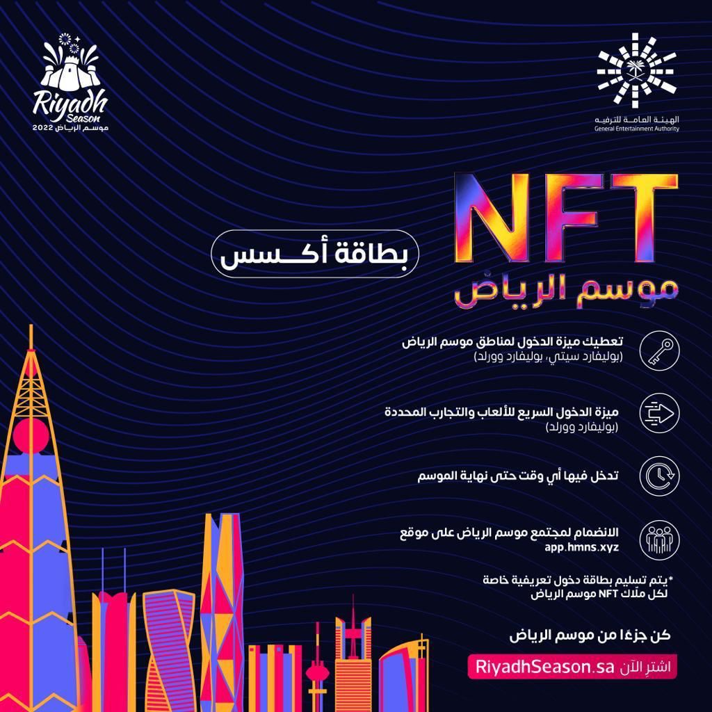 يقدم موسم الرياض 2022 لزواره تجربة فريدة بطريقة مبتكرة وحديثة، تتمثل في استخدام تقنية الـNFT عن طريق إطلاقها بطاقة أكسس التي تمكّن حامليها من دخول مناطق الموسم الترفيهية وحضور فعالياته المتنوعة، التي تشمل الألعاب الإلكترونية والمهرجانات والمسرحيات السعودية والعربية، والحفلات الغنائية، والمعارض المحلية والعالمية.