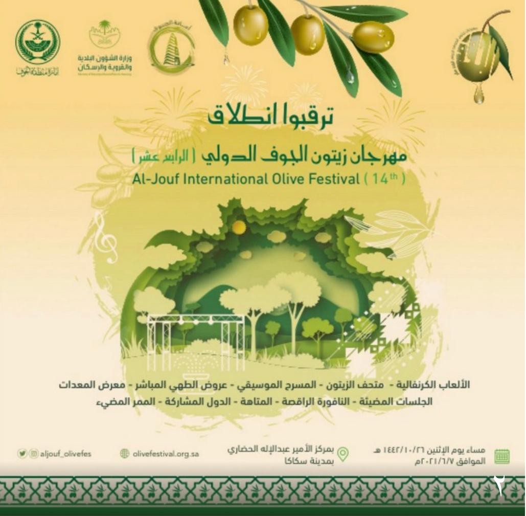 يُطلق أمير منطقة الجوف فيصل بن نواف بن عبدالعزيز مهرجان زيتون الجوف الدولي الرابع عشر، مساء يوم الاثنين المقبل، بمركز الأمير عبدالإله الحضاري بمدينة سكاكا.