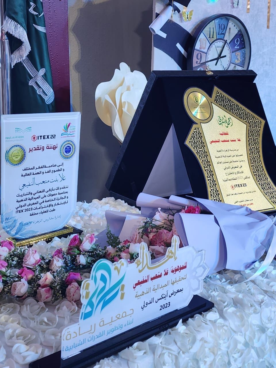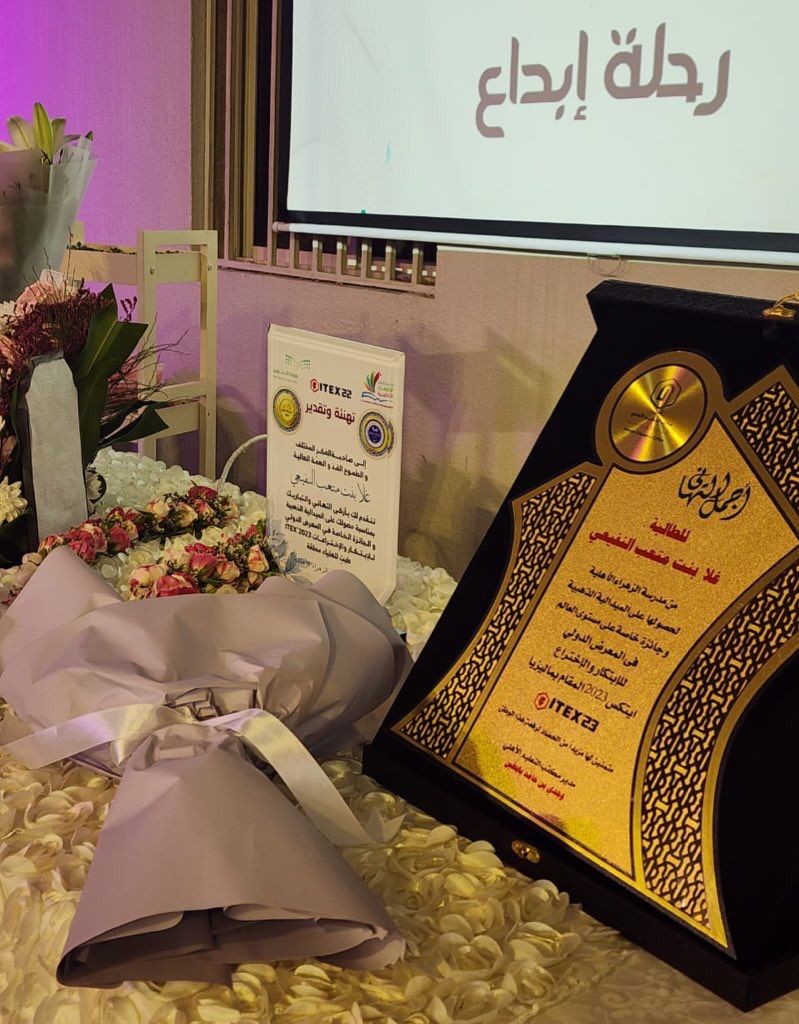 كرمت الإدارة العامة للتعليم بمنطقة مكة المكرمة ممثلةً بإدارة الموهوبات اليوم الخميس الموافق 28 / 10 / 1444هـ ، وبحضور مساعدة المدير العام للشؤون التعليمية لمياء بنت عبدالعزيز بشاوري الطالبة غلا بنت متعب النفيعي الحاصلة على الميدالية الذهبية وجائزة خاصة من ( wllpa ) وذلك في معرض آيتكس 2023 الدولي للاختراع والابتكار والتكنولوجيا والمقام في العاصمة الماليزية كوالا لمبور خلال الفترة من 7-14 مايو 2023 م، بحضور مديرة الإدارة نادية بندقجي ، وعدد من تربويات تعليم مكة .