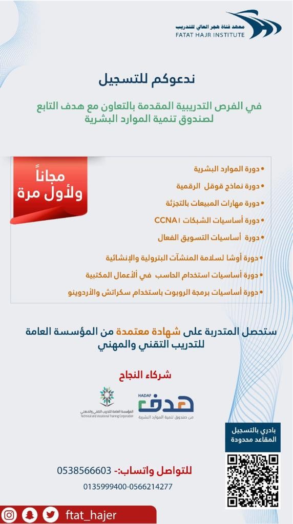 حصرياً ولأول مرة بالأحساء يطلق معهد فتاة هجر العالي للتدريب التابع لشركة هجر للتعليم والتدريب التقني وبالتعاون مع صندوق الموارد البشرية هدف دوراته المجانية، ذلك تحقيقًا للرؤية الحكيمة في دعم موظفات القطاع الخاص للعمل وتأهيلهم حسب متطلبات احتياج سوق العمل.