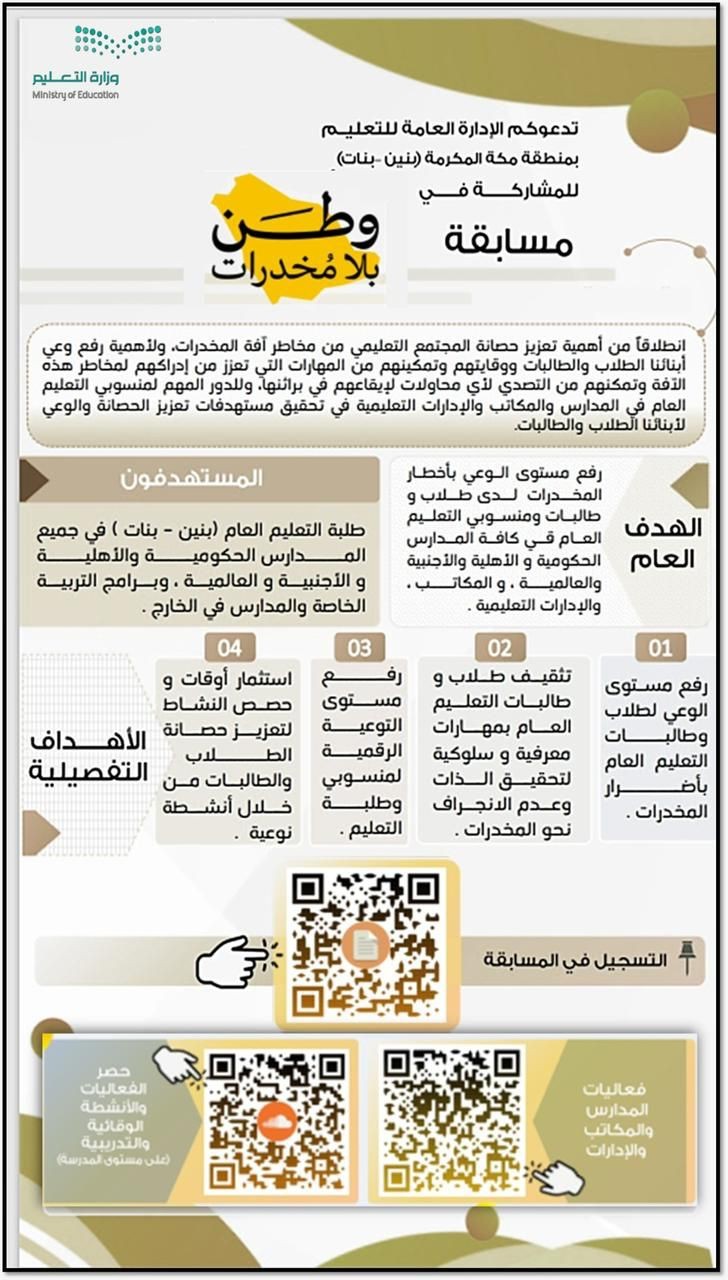 تنفذ الإدارة العامة للتعليم بمنطقة مكة المكرمة – ممثلة في إدارة النشاط الطلابي- مسابقة " وطن بلا مخدرات "بفعاليات تثقيفية وتوعوية وتنافسية للوقاية من أخطار وأضرار المخدرات ، انطلاقاً من اهتمام وزارة التعليم بتعزيز حصانة المجتمع التعليمي من مخاطر آفة المخدرات ولأهمية رفع الوعي لأبنائنا الطلاب والطالبات ووقايتهم وتمكينهم من المهارات التي تعزز من إدراكهم لمخاطر هذه الآفة وتمكنهم من  التصدي لأي محاولات لإيقاعهم في براثنها وللدور المهم لمنسوبي التعليم العام في المدارس والمكاتب والإدارات التعليمية في تحقيق مستهدفات تعزيز الحصانة والوعي لهم.