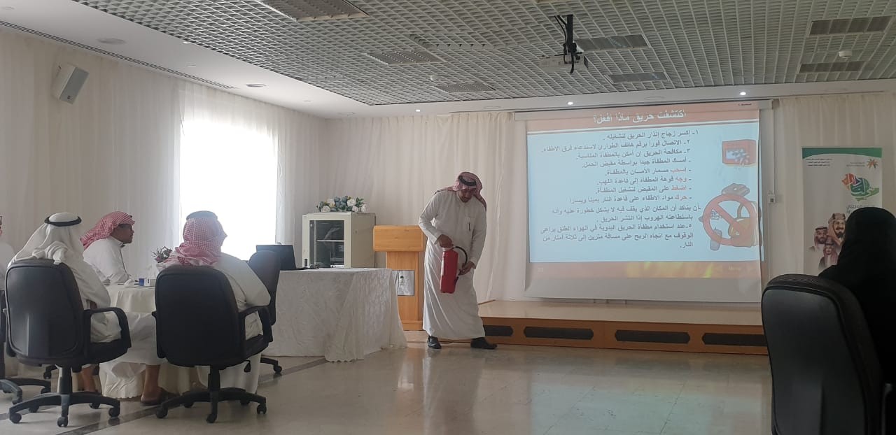 كما تم التدريب على طريقة فتح المصعد عند تعطله بشكل عملي وإجراء خطة إخلاء وهمية مع المتدربين وطريقة استخدام طفاية الحريق.
