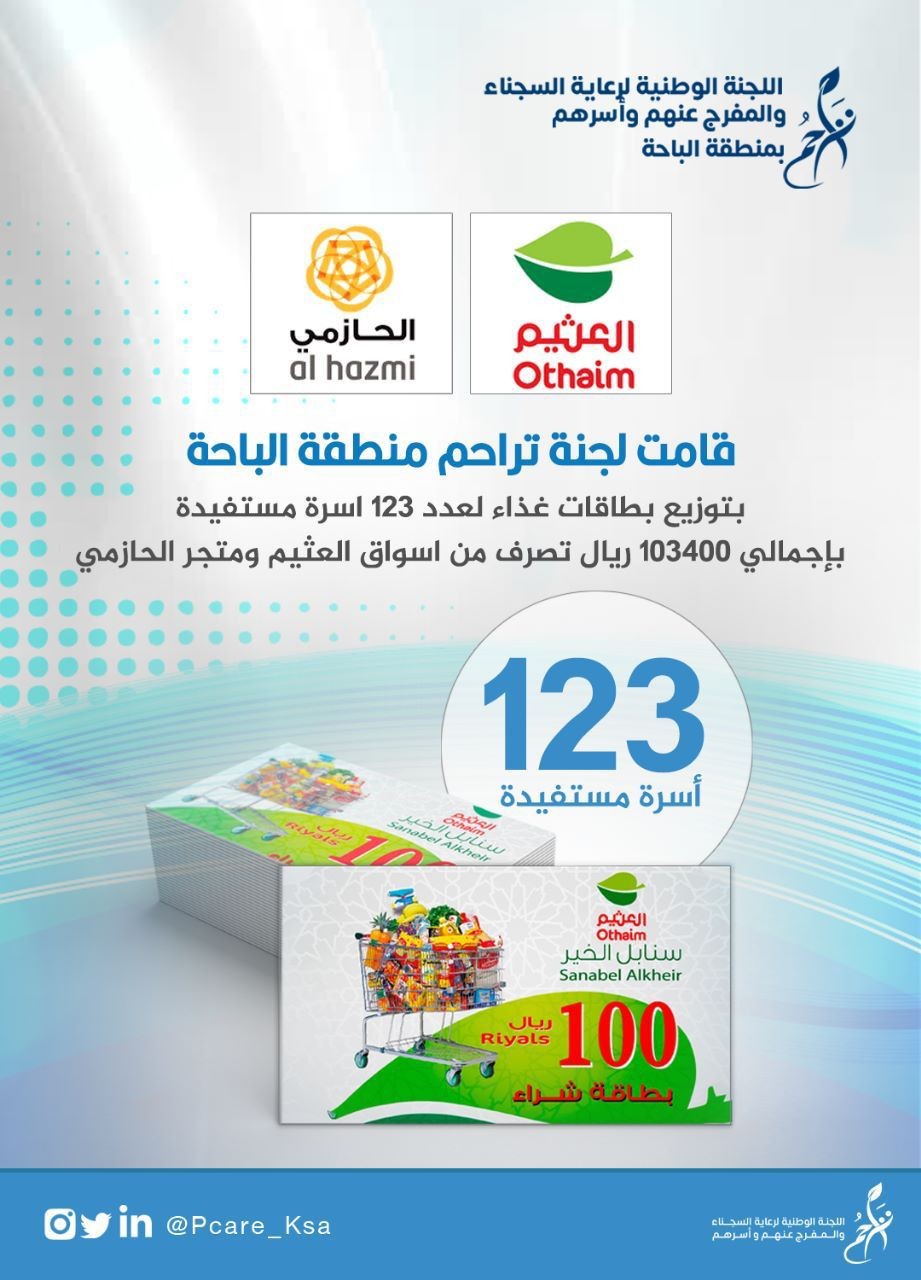 وزعت لجنة رعاية السجناء بالباحة تراحم " 928 " بطاقة غذائية على أسر السجناء بالمنطقة بمنطقة الباحة، وذلك في إطار أهداف اللجنة من رعاية أسر النزلاء والمفرج عنهم.