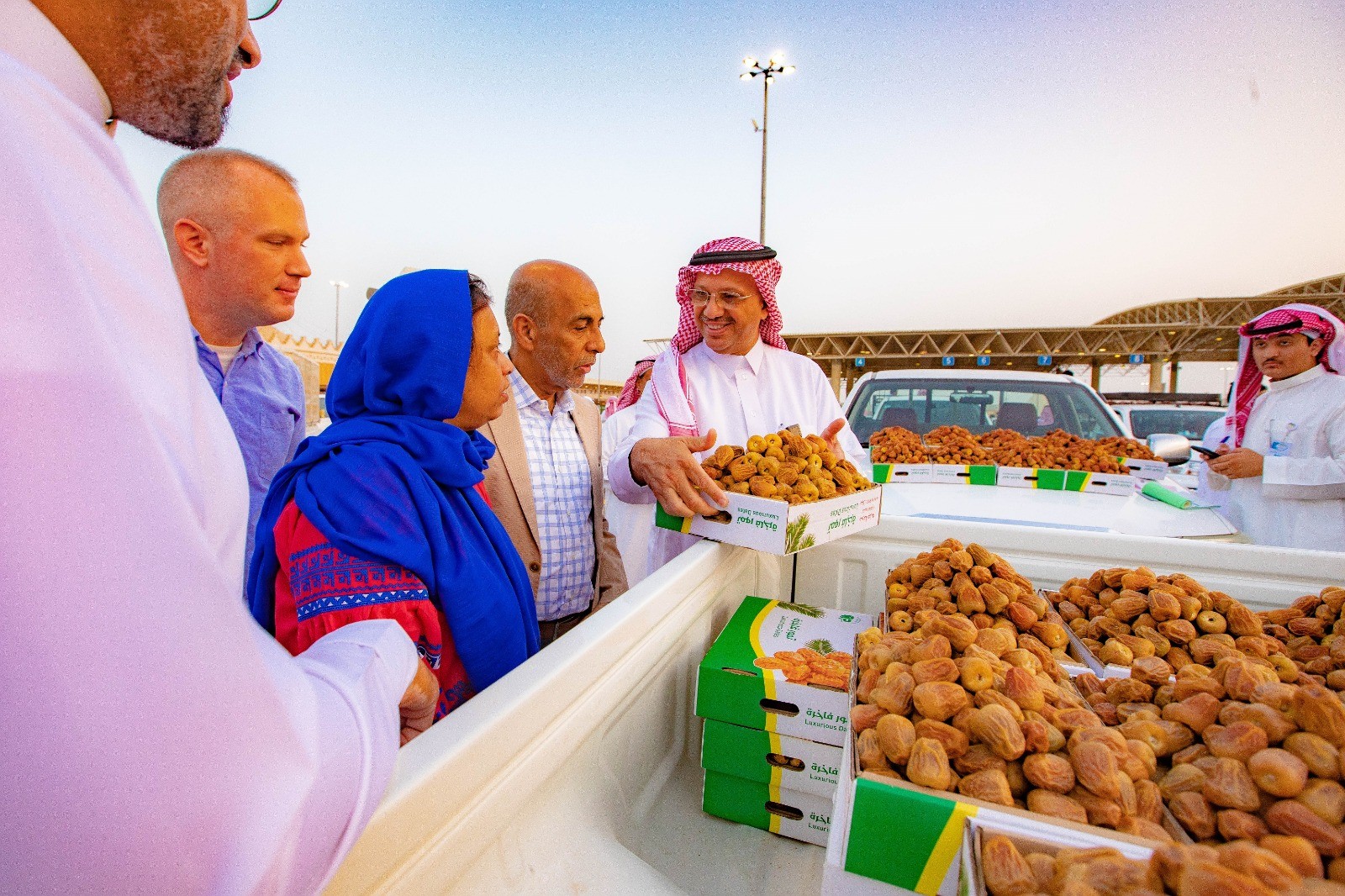 و أطلع على ساحة المزادات والأنشطة والفعاليات المصاحبة و عمليات البيع والشراء و كميات التمور الواردة للسوق، مشيداً بما يتضمنه الكرنفال من فعاليات وبرامج وأنشطة متميزة تلامس شرائح المجتمع .