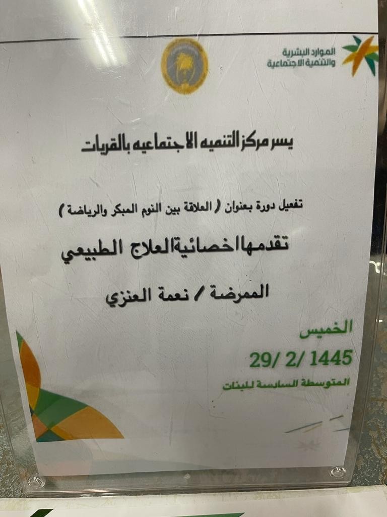 أقام مركز التنمية الاجتماعية بمدينة القريات دورة توعوية ناجحة في المدرسة المتوسطة السادسة للبنات بعنوان "العلاقة بين النوم المبكر والرياضة".