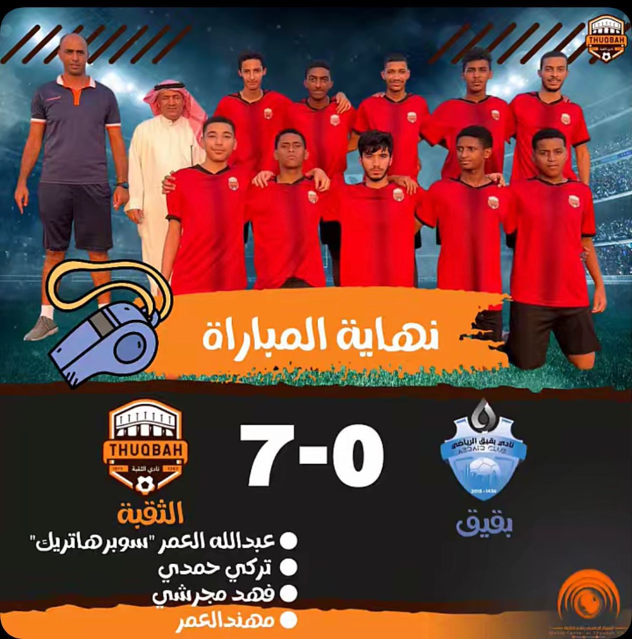 أحرز أهداف اللقاء عبدالله العمر " سوبر هاتريك " ،تركي حمدي ،فهد مجرشي ، مهند العمر ويتكون الجهاز الفني لنادي الثقبة من بسام المناعي مديرآ فنيآ ،فارس مبارك ،سعد المسرحي إداري الفريق ،أحمد جريدة مدرب حراس المرمي ، سعيد مرزوق مدير الفئات السنية .