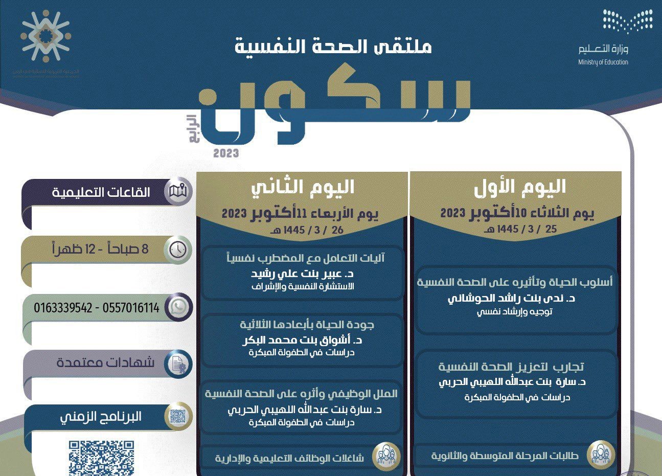 وفي اليوم التالي كانت العناويين عن آليات التعامل مع المضطرب نفسيًا و جودة الحياة عن طريق د.عبير رشيد و د.أشواق البكر.