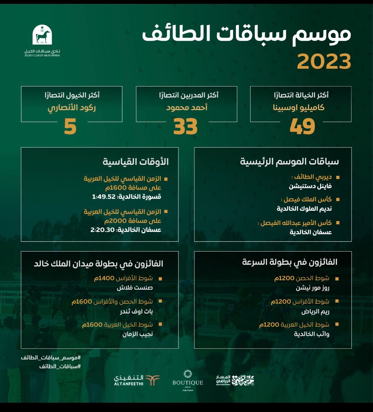 بأن النجاح الكبير الذي صاحب موسم سباقات الطائف 2023 والذي شهد مزيداً من التطور وارتفاعاً في مستوى السباقات بميدان الملك خالد من خلال إضافة سباقات جديدة والتحسن الذي طرأ على برنامج سباقات الخيل العربية وخيل الثروبيرد على السواء، وهذا مما أسعد القائمين على موسم الطائف.