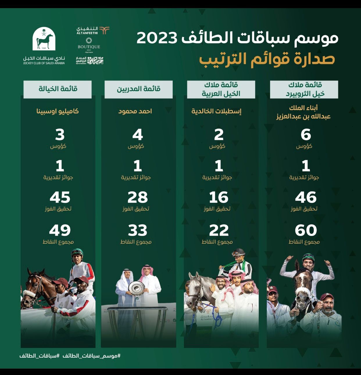 ختام الموسم كان مناسبة لتتويج أفضل خيال وأفضل مدرب وأفضل مالك لخيل الثروبيرد وأفضل مالك للخيل العربية الأصيلة.