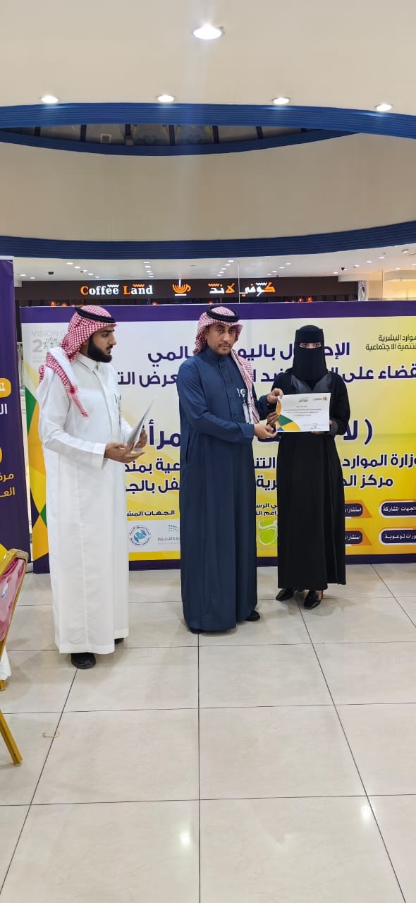 وشارك في المعرض عدد من الجهات ذات العلاقة وهي فرع هيئة حقوق الإنسان وإدارة التعليم وجمعية تواد للتنمية الأسرية وجمعية توافق للإصلاح الأسري ولجنة شؤون الأسرة وبرعاية رسمية للمعرض من مركز براعم التحدي للرعاية النهارية وبمشاركة عدد من المتطوعات.
