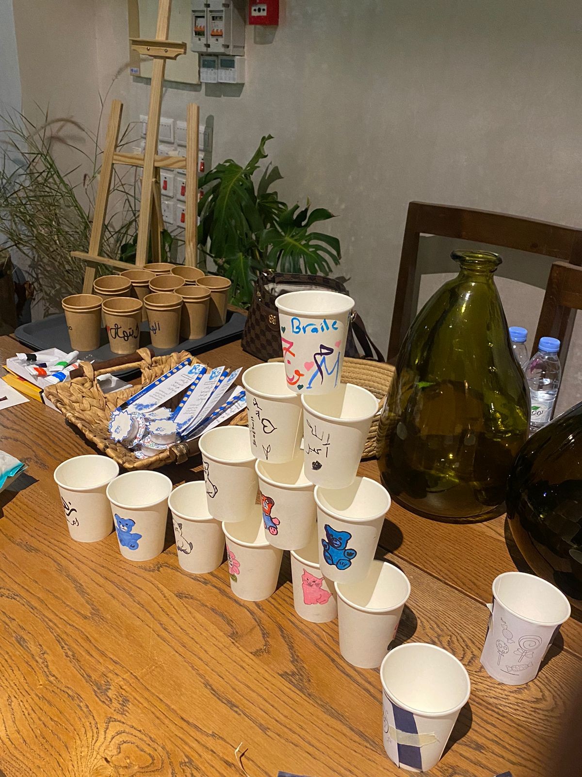 ورشة للاطفال وذوي الأعاقه تضمنت رسم مباشر وطباعة على الاكواب ومسابقة الحروف بطريقة برايل وتم توزيع كروت مشروبات وحلا مجانيه للحضور .