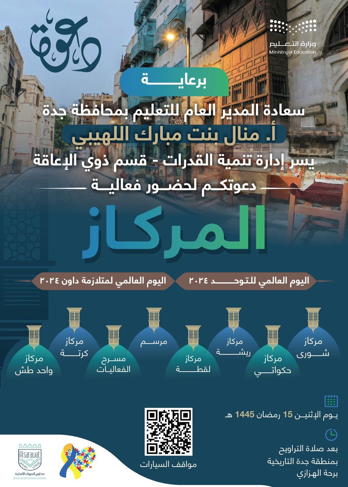 برعاية مدير عام التعليم بمحافظة جدة منال بنت مبارك اللهيبي تنظم إدارة تنمية القدرات "قسم ذوي الإعاقة"، الاثنين المقبل فعالية "المركاز" للاحتفاء باليوم العالمي لمتلازمة داون 2024, واليوم العالمي للتوحد 2024, وذلك بمنطقة جدة التاريخية بحضور عدد من قيادات التعليم ومشاركة العديد من طلاب وطالبات مدارس جدة.