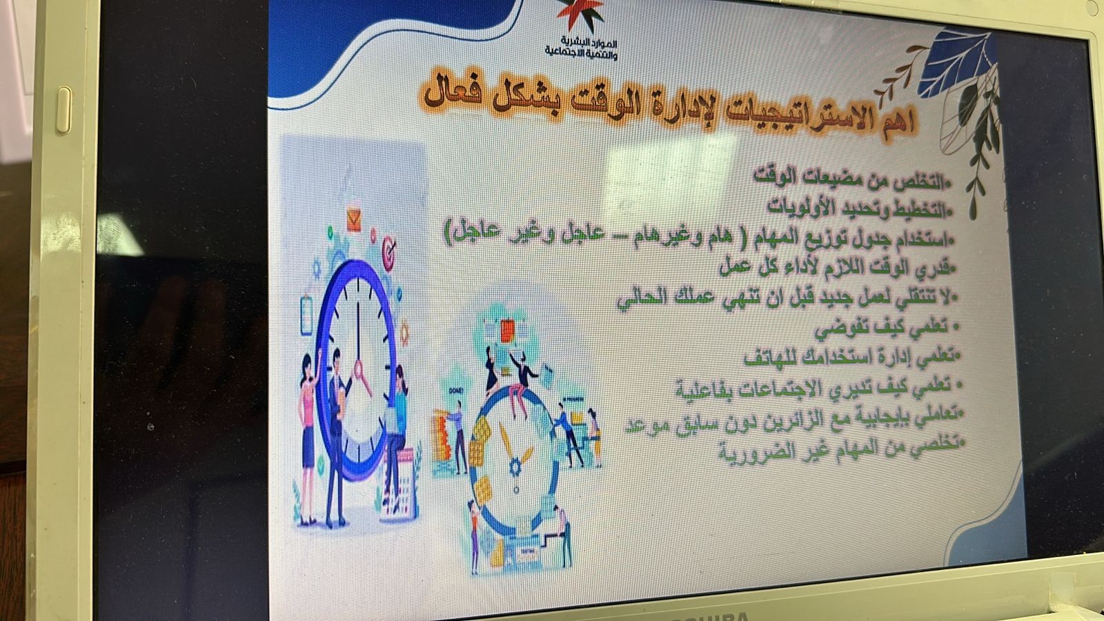 استهدفت موظفات مركز التنمية وذلك بهدف توضيح مفهوم إدارة الوقت، و استعراض مهارات الوقت ومعوقات إدارته، بيان أهم الاستراتيجيات لإدارة الوقت بشكل فعال، عرض مفهوم ضغوط العمل، وعلامات ضغط العمل النفسي والجسدي، شرح مصادر ضغط العمل وأسبابها ومهارات التعامل مع ضغوط العمل.