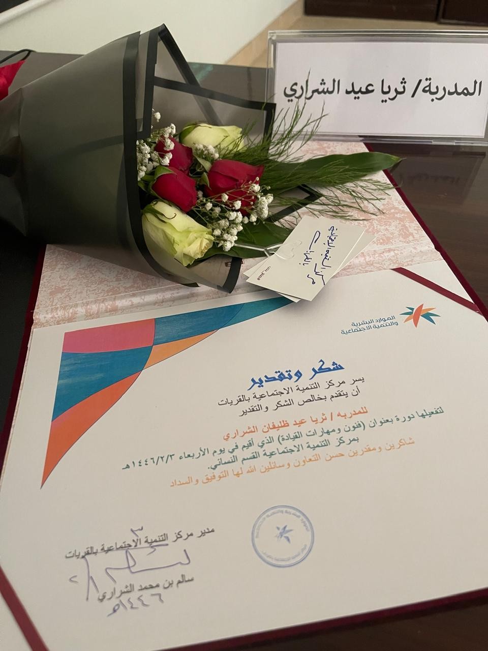 من جانبه قدم مدير مركز التنمية الاجتماعية بالقريات الأستاذ سالم بن محمد الشراري . شكره وتقديره لخادم الحرمين الشريفين الملك سلمان بن عبدالعزيز و ولي عهده الأمير محمد بن سلمان على دعمهم المستمر في نهضة هذا الوطن ضمن رؤية 2030 ، وكما قدم شكره للمدربة على جهودها بالإضافة للقسم النسائي بقيادة الأستاذة فصل بنت خلف الخميس ولكافة منسوبي المركز في القسم النسائي.
