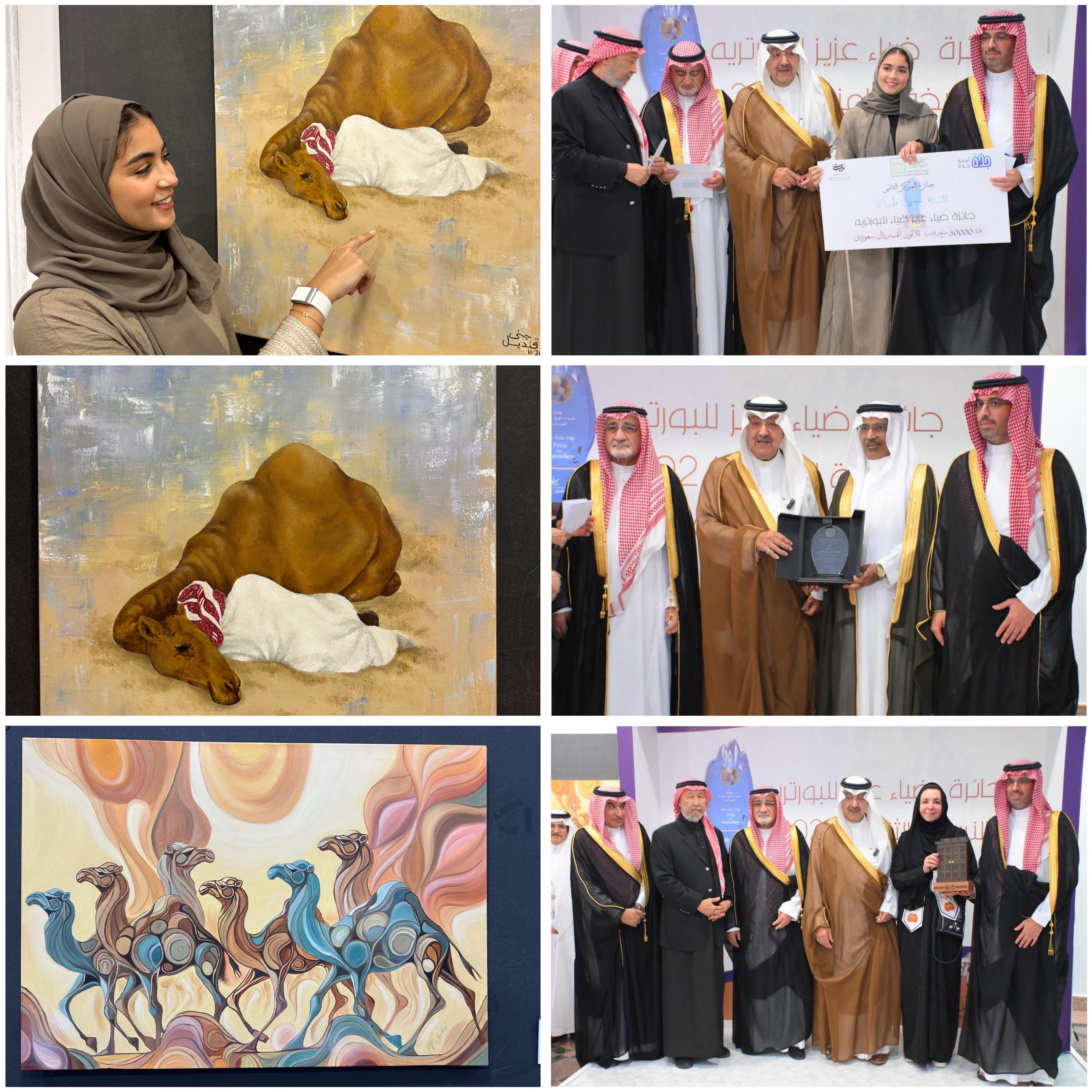 في سياق مواكبتها للأحداث الثقافية والفنية، تفاعلت جائزة ضياء عزيز للبورتريه مع استضافة منطقة مكة المكرمة لمعرض "الجمل عبر العصور"، الذي نظمته شركة ليان، وأمانة محافظة جدة، وجمعية الثقافة والفنون وذلك بمركز الملك عبدالعزيز الثقافي بجدة، في ختام فعاليات "عام الإبل"، حيث خصصت الجائزة ثيمة "الإبل" موضوعًا رئيسًا للتنافس في نسختها الثامنة، لتجد تفاعلًا كبيرًا من قبل الفنانين والفنانات، فقد تلقّت ما يقارب الـ(400) عملًا تشكيليًا من مختلف مناطق ومحافظات المملكة، فشكّلت لها لجنة تحكيم مكوّنة من البروفيسور عبدالله الفتيني، والدكتورة منال الرويشد، والفنان ضياء عزيز، خلصت إلى ترشيح (38) منها لخوض المنافسة على الجوائز، حيث توّج بالمركز الأول الفنان التشكيلي سعيد سعيد الشهراني، حاصلًا بذلك على درع الجائزة مع مبلغ (50) ألف ريال، فيما حلت ثانيًا الفنانة جنى قنديل وحصلت على مبلغ (30) ألف ريال، أما المركز الثالث فكان من نصيب الفنانة التشكيلية إيمان حمد حسين، لتحصل على مبلغ (20) ألف ريال.