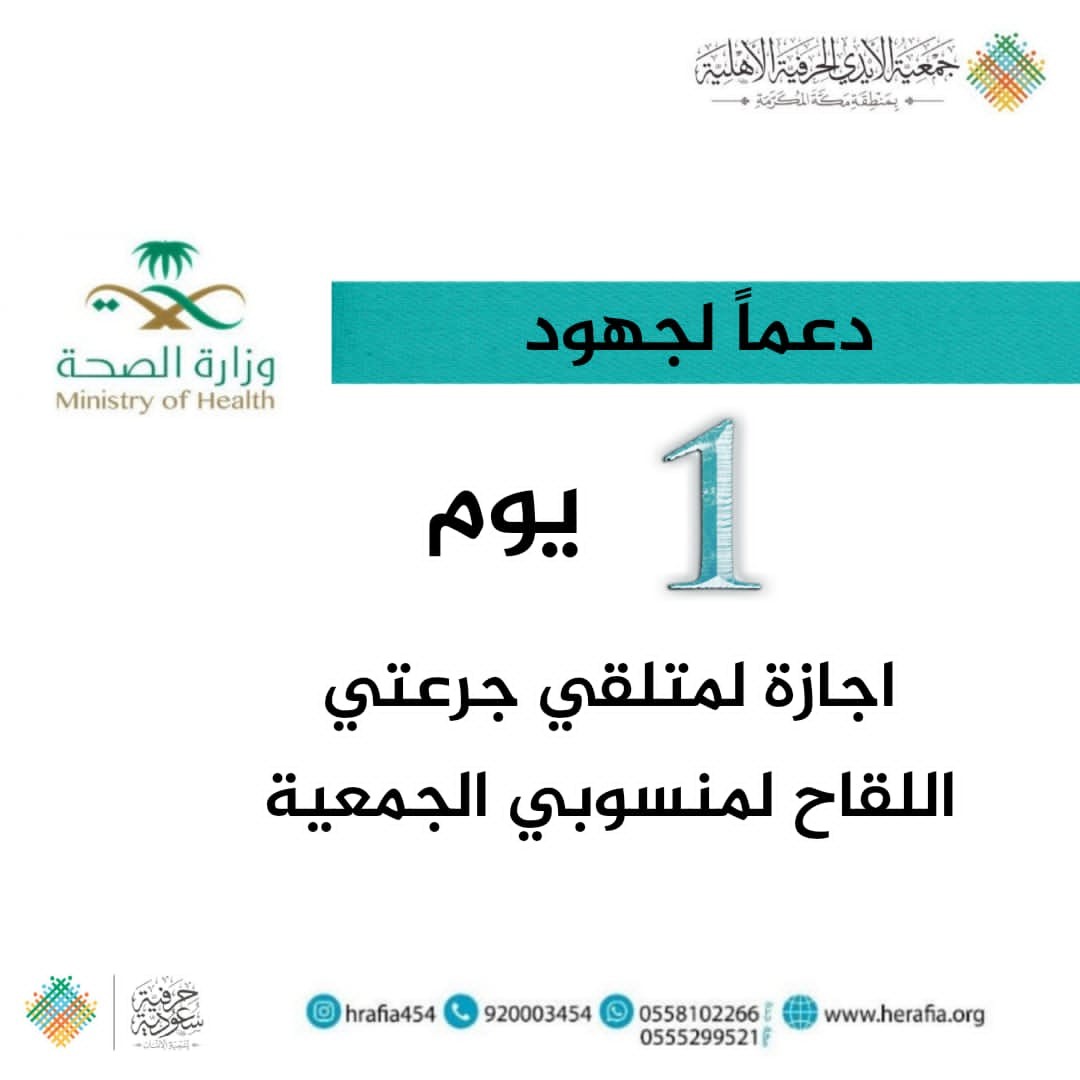 منحت جمعية الأيدي الحرفية الأهلية كافة منسوبيها إجازة لمدة يوم واحد عند تلقي جرعتي اللقاح دعمـًا لجهود وزارة الصحة وللمساهمة في عودة الحياة لطبيعتها، وبما يحقق اعلى درجات الوقاية لجميع المتعاملين مع الجمعية من مستفيدين ومنسوبين وأعضاء.