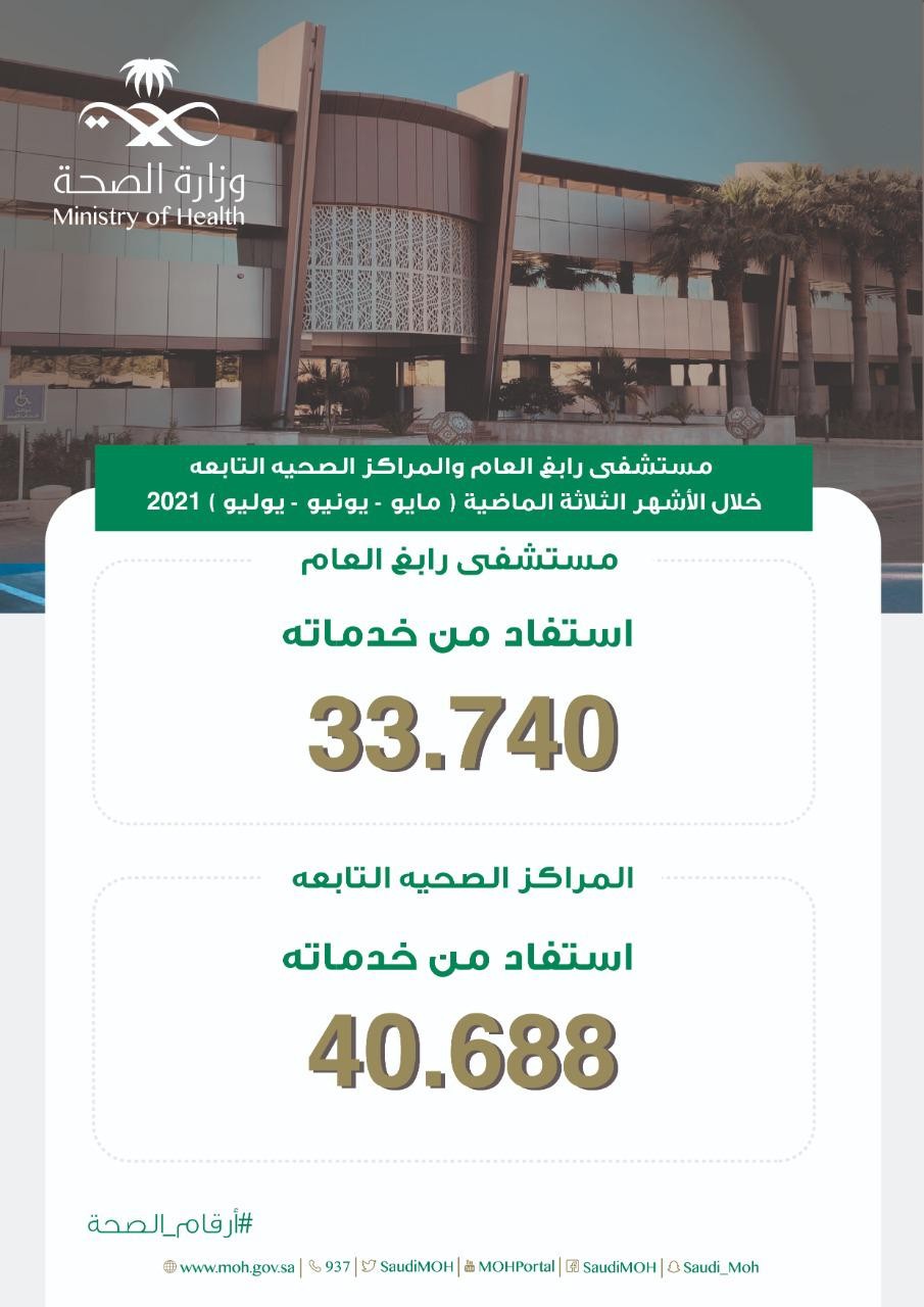 كما بلغ عدد المراجعين للمراكز الصحيه التابعة لمستشفى رابغ العام خلال الفترة نفسها (40.688) مراجع ، حيث يتبع لمستشفى رابغ العام عدد ثلاثة عشر مركزًا صحيًّا.