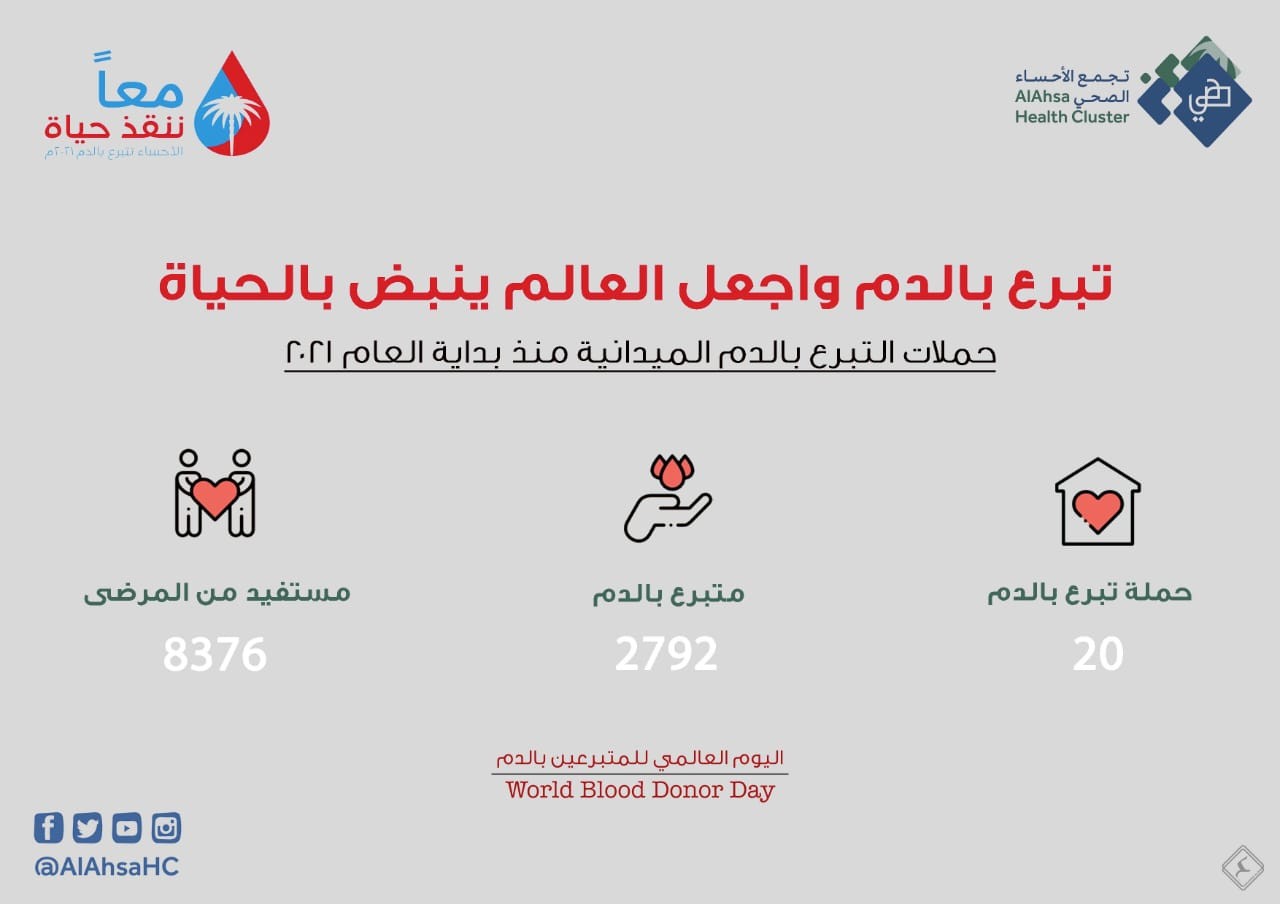 قال  تجمع الأحساء الصحي أن عدد المتبرعين بالدم ضمن  حملة  التبرع بالدم "معاً ننقذ حياة" التي أطلقها منذ مطلع العام الحالي  بلغ  (2792) متبرع بالدم من مختلف الفصائل، حيث إستفاد منها  بفضل الله  (8376) مستفيد  من المرضى المحتاجين للدم، سواءً بسبب أمراض مزمنة أو وراثية أو بسبب إصابات نازفة أو لإجراء العمليات الجراحية وغيرها.