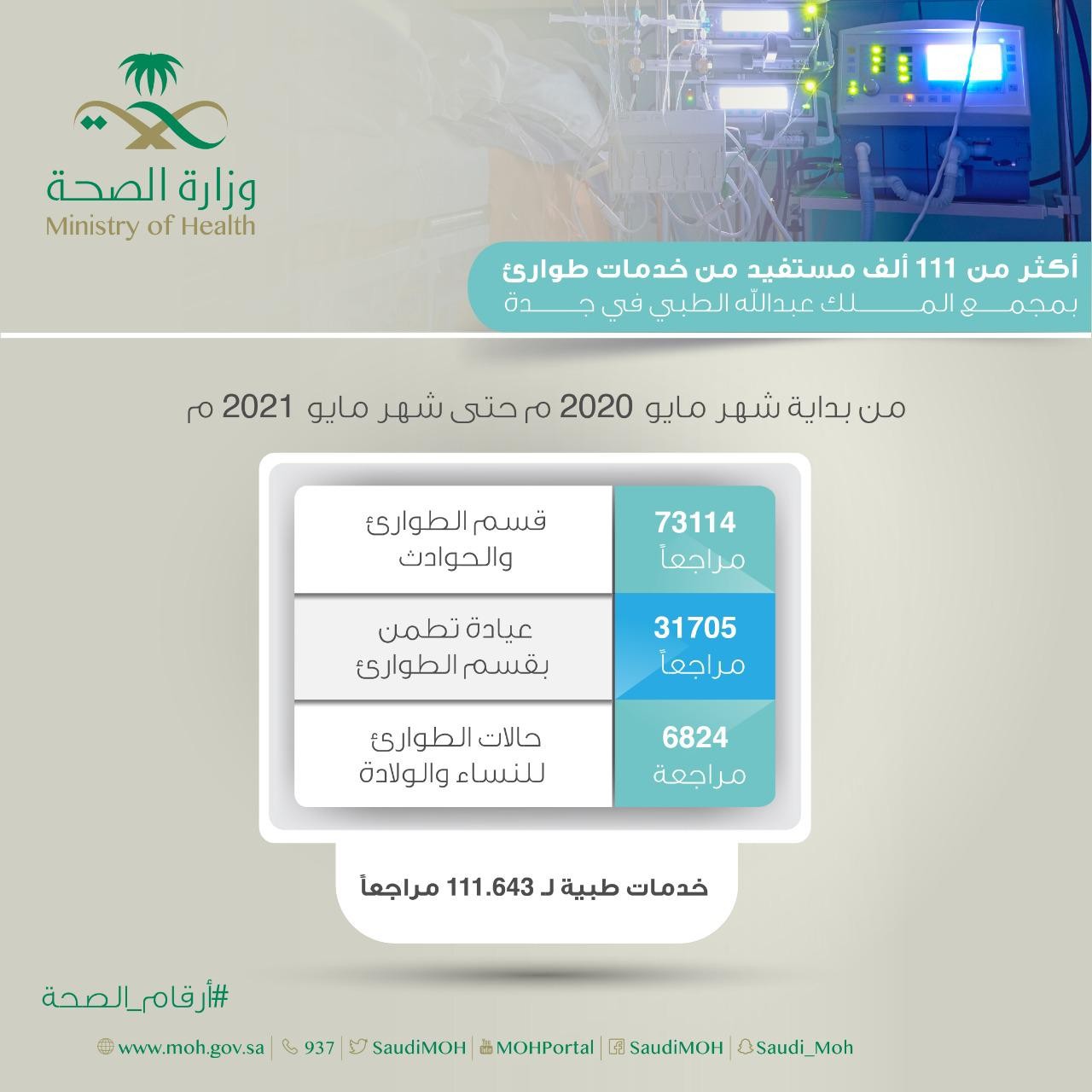 قدّم قسم الطوارئ والحوادث بمجمع الملك عبدالله الطبي في جدة خدماته الطبية لـعدد 111.643 مراجع وذلك خلال الفترة من بداية شهر مايو 2020م حتى شهر مايو 2021م.