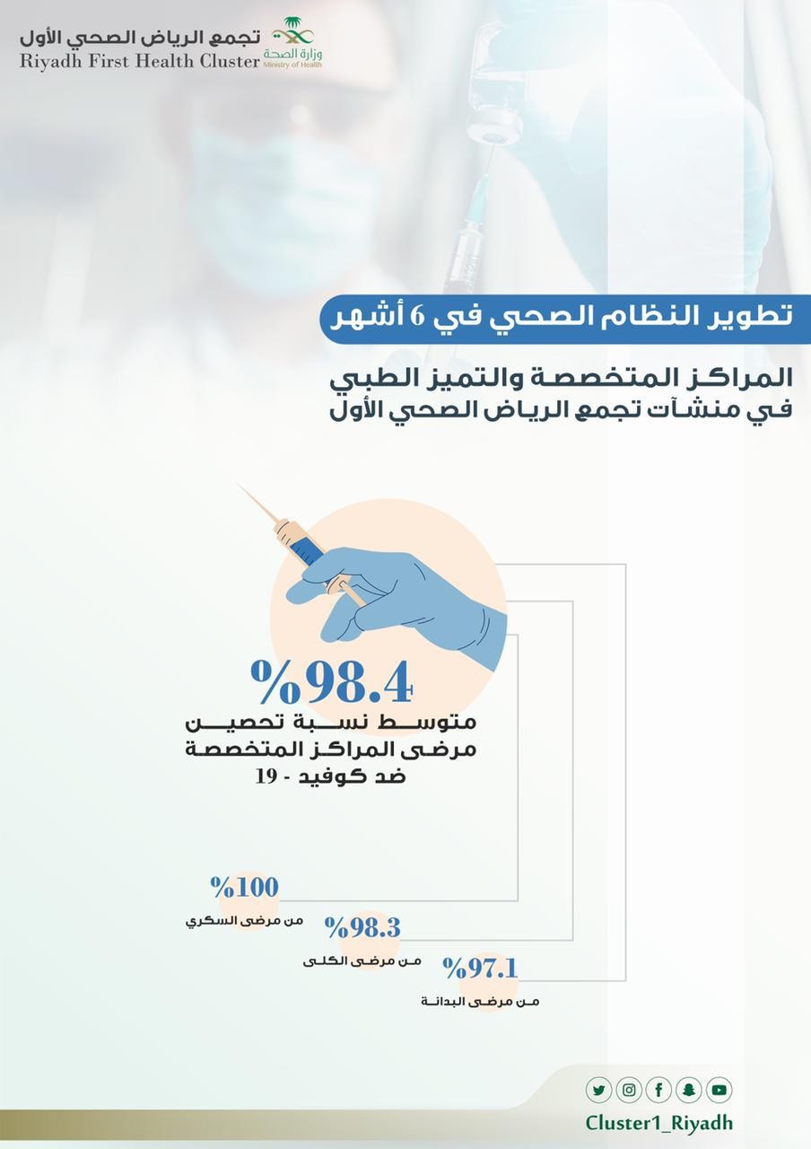 بالإضافة إلى أنه بلغ متوسط نسبة تحصين مرضى المراكز المتخصصة في منشآت "التجمع الأول" ضد كوفيد-19 إلى 98.4%، حيث بلغت نسبة المحصنين من مرضى السكري إلى 100%، ومرضى الكلى بنسبة 98.3%، وتم تحصين 97.1% من مرضى البدانة.