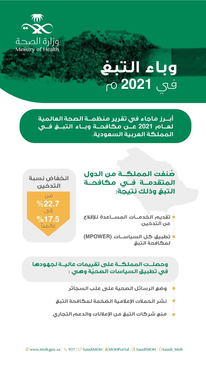 صنفت منظمة الصحة العالمية، المملكة من الدول المتقدمة في مكافحة التبغ لعام 2021م، معتمدة على وعي المواطن والمقيم في إنجاح وتنفيذ خططها.