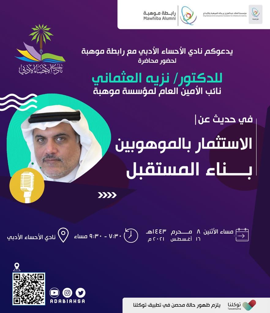 ينظم نادي الأحساء الأدبي بالشراكة مع رابطة موهبة مساء الاثنين الثامن من شهر محرم الجاري محاضرة يتحدث فيها الدكتور نزيه العثماني، نائب الأمين العام لمؤسسة موهبة عن "الاستثمار بالموهوبين بناء المستقبل"، حضورياً على مسرح النادي عند الساعة السابعة والنصف مساء.
