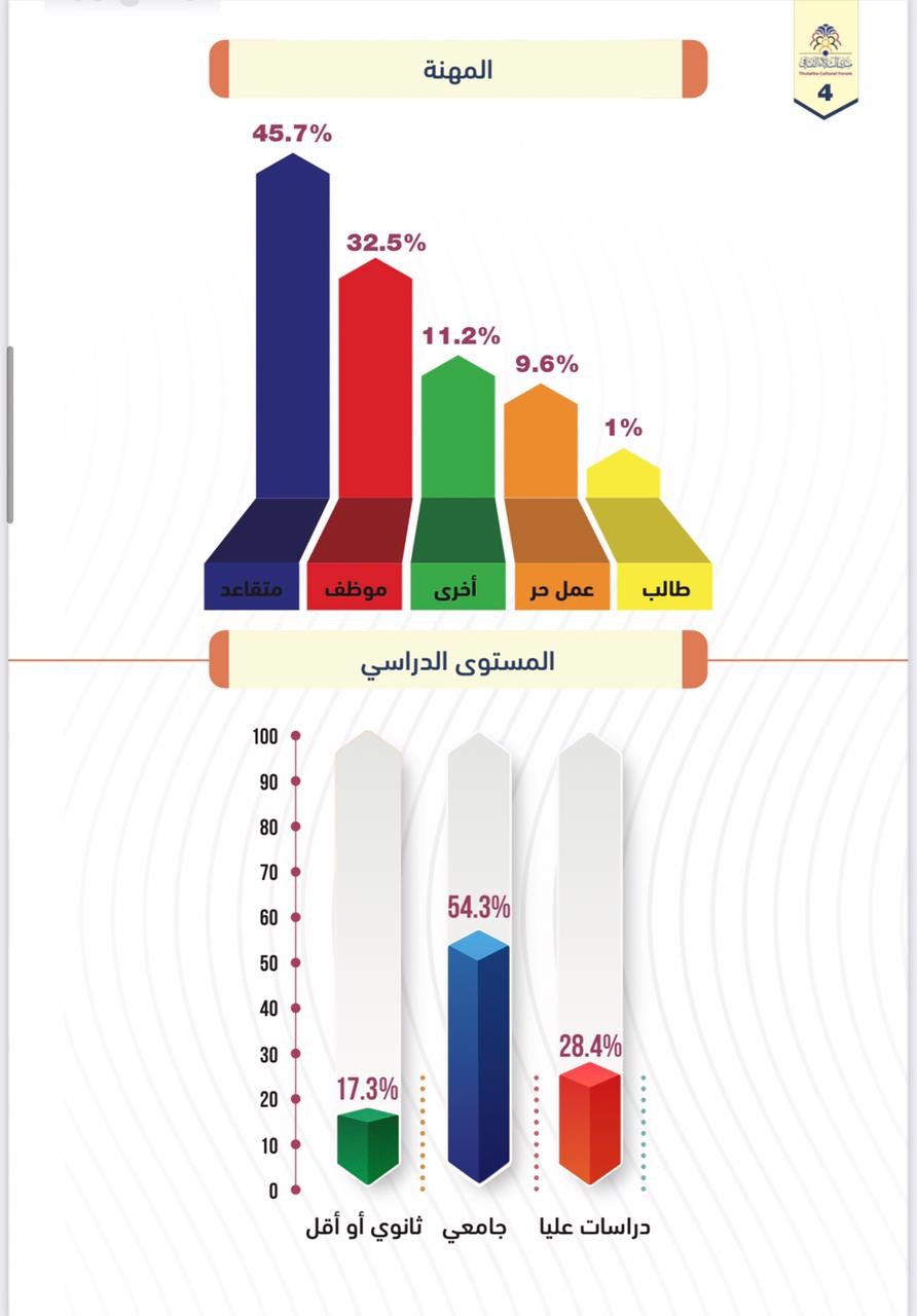 بلغ عدد أفراد العينة العشوائية المشاركة في استبانة منتدى الثلاثاء الثقافي هذا العام 200 مشاركا من مختلف الأعمار والمناطق والمهن.
