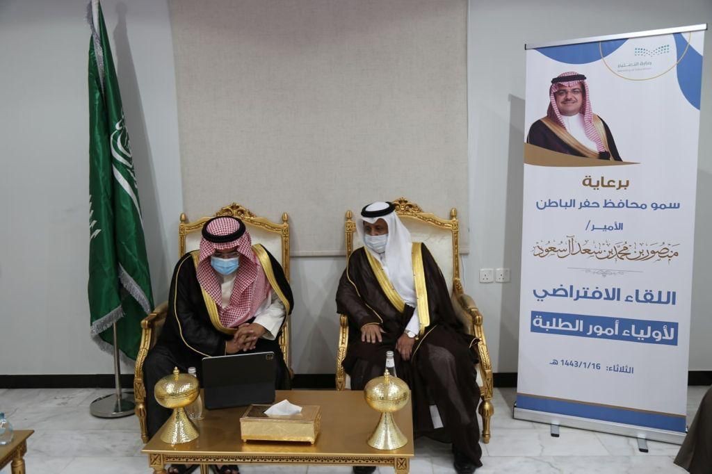 رعى محافظ حفرالباطن الأمير منصور بن محمد بن سعدآل سعود في إدارة التعليم مساء أمس الثلاثاء اللقاء الافتراضي عن بعد (عبر تطبيق zoom) لأولياء أمور الطلاب والطالبات الذي نظمه قسم التوجيه والإرشاد بتعليم حفرالباطن في تمام الساعة 7 مساءً.