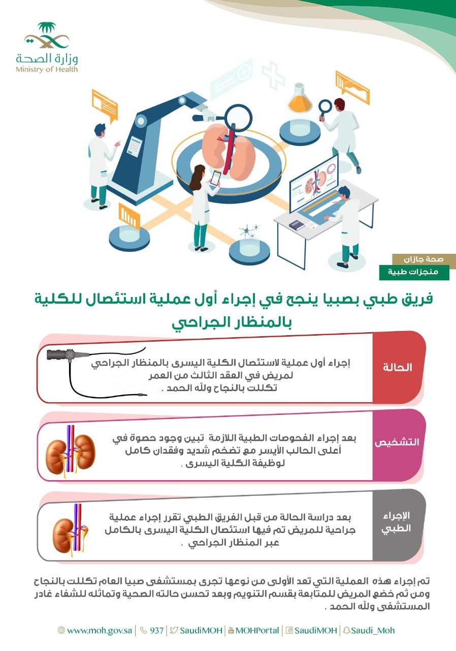 ذكرت صحة جازان بأن أطباء جراحة المسالك البولية بمستشفى صبيا العام أجرى أول عملية لاستئصال الكلية اليسرى بالمنظار الجراحي لمريض في العقد الثالث من العمر كان يعاني الآلام المزمنة في الخاصرة اليسرى نتيجة تضخم الكلية تكللت بالنجاح ولله الحمد.